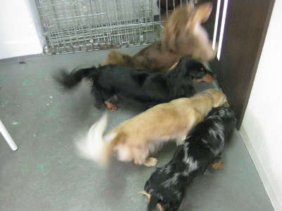 ダックスいっぱいday❤ 2012,09,03,Mon 朱羅ちゃん(ダップル)・羅々ちゃん(クリーム) 姫愛桃ちゃん(ブラックタン)・流亜ちゃん(チョコ) シャンプー中のパシャリ ドライ中のパシャリ お疲れ様でした みんなでお迎えを待っていました 流亜ちゃんこんなに大きくなりましたが・・・ こんなにも小さかったんですよキュン チョコ君(チョコ)・クロ君(ブラックタン) チョコ君ホントに気持ち良かったのか、終わってからもねむねむ(笑) クロ君のバブル中抜け毛も浮いてます お疲れ様でした オーナーが大好きなんだって