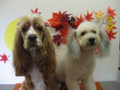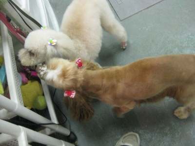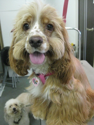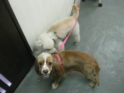 仲良し❤ 2012,09,03,Mon ミミちゃん(コッカー)・モコ君(プードル) ミミちゃんのぺろりん モコ君は不安な様子・・・ カット前のお顔 可愛くなりました 「私達仲良しでしょ?」一方的にも見えなくもないけど・・・(笑)