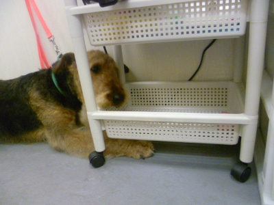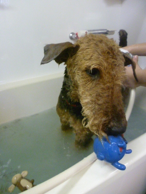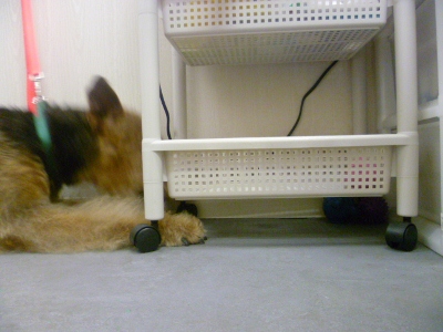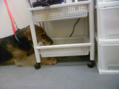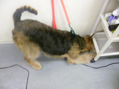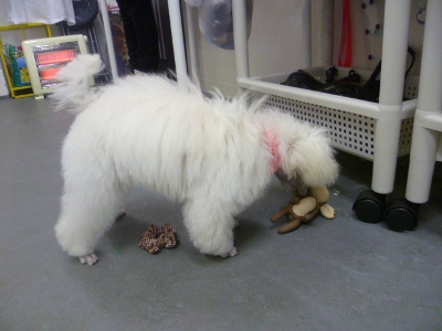 トリミング室に入るとまず今日のおもちゃを選ぶニノちゃんです