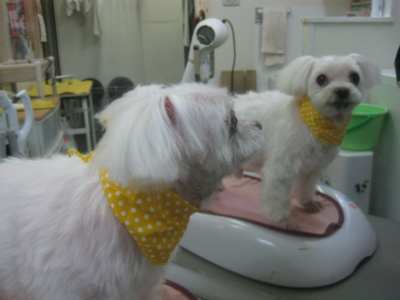 はるちゃん・うららちゃん・ジャック君✿ 2014,12,03,Wed はるちゃん&うららちゃんです シャンプーから上がったうららちゃんを撮影中「可愛く撮れた??」と首をかしげているとき・・・ はるちゃんも「え?何か変かな?」と首をかしげていました(笑) ホントに可愛く、癒してもらいました ジャック君です とってもお利口さんのジャック君 お顔もスッキリさせて完成 鏡越しにパシャリ